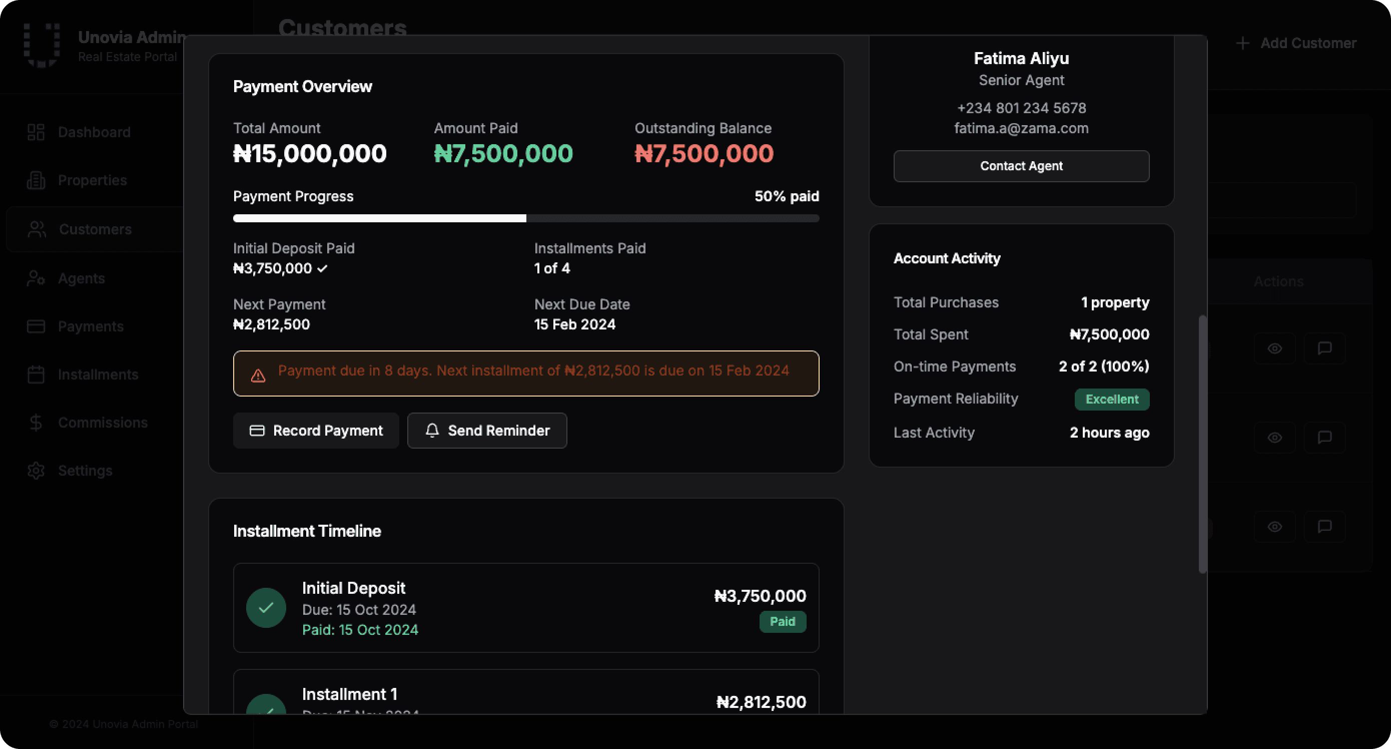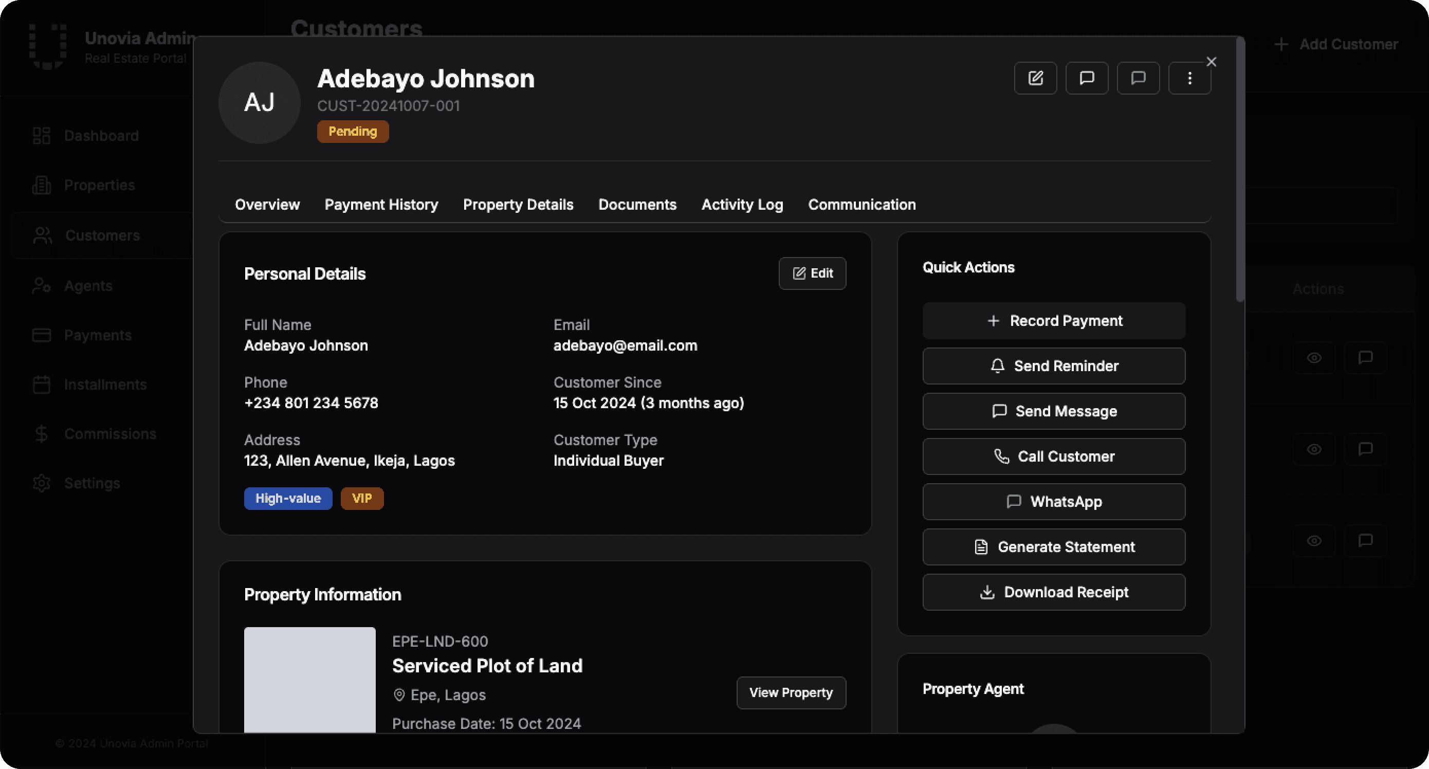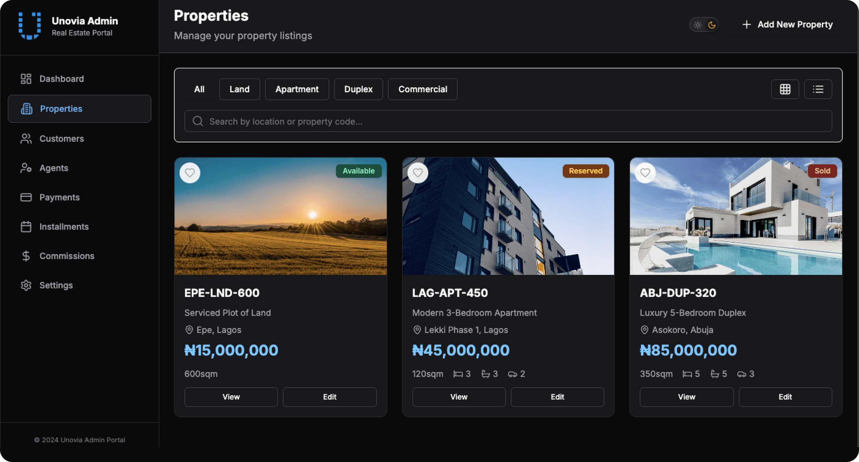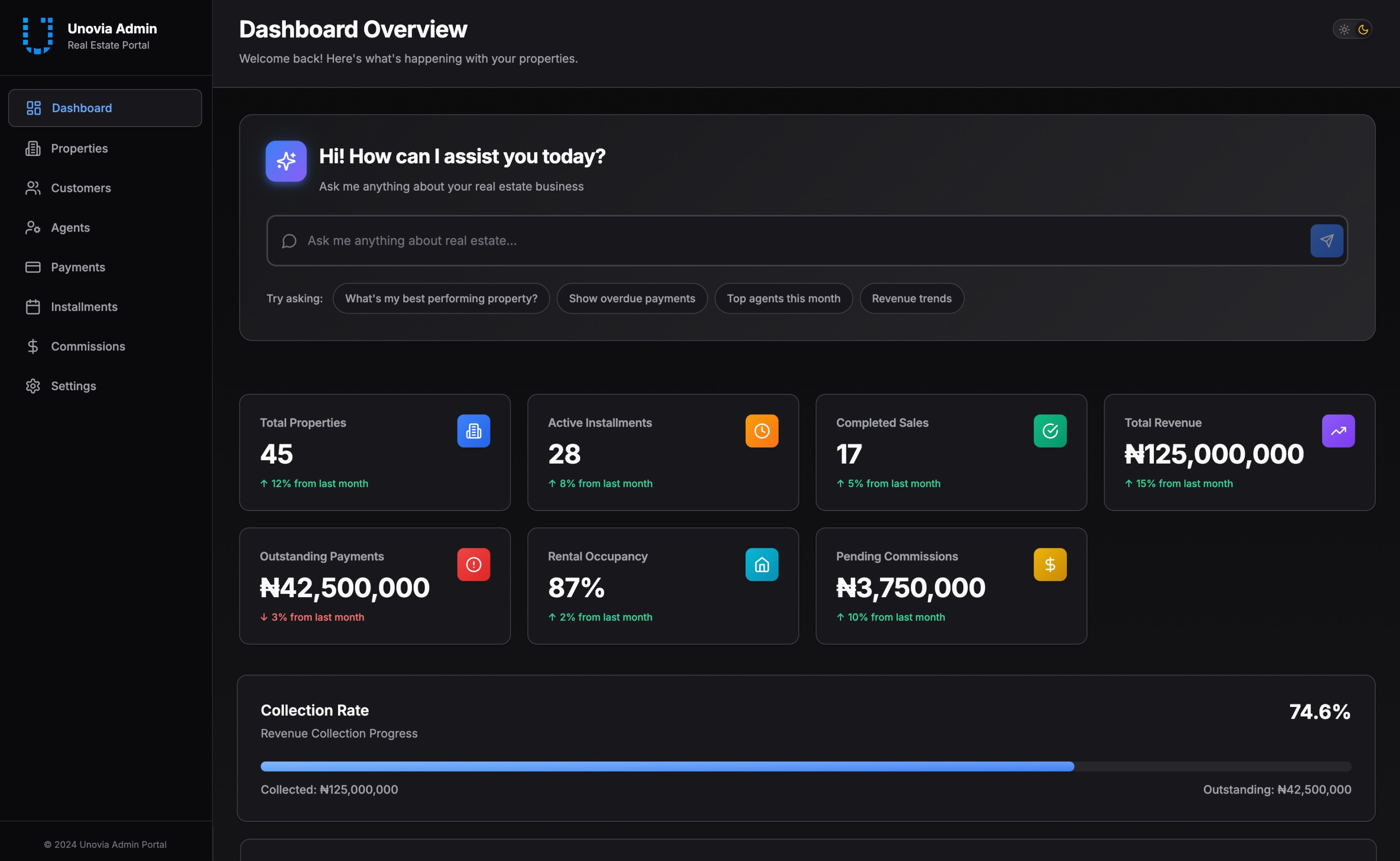 UNOVIA helps real estate companies manage properties, clients, commissions, and payouts all powered by intelligent automation and AI.